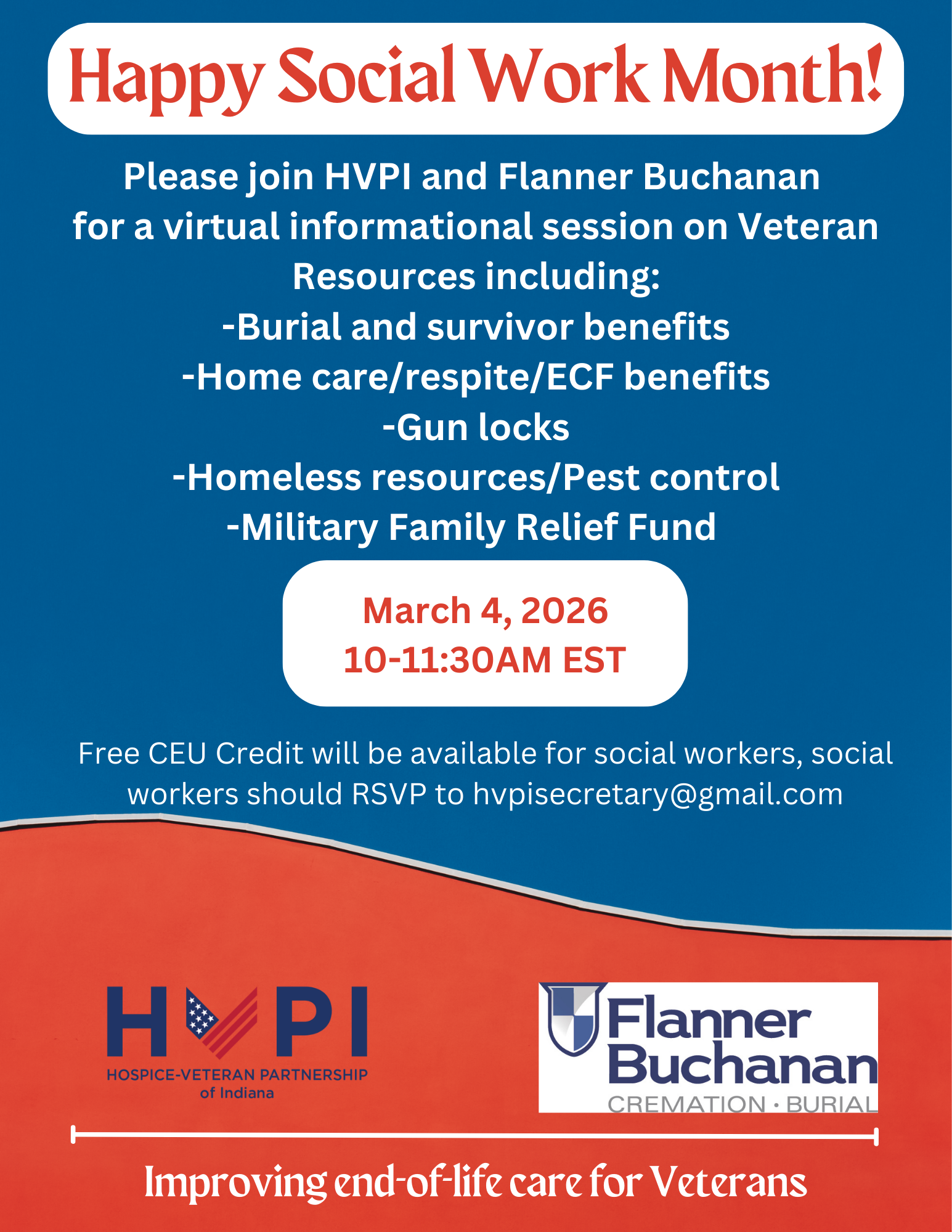 Thank you for joining us for our 2025 Quarter 2 meeting on 6/4/25. Meeting PowerPoint: DOWNLOAD HERE Navigating Difficult Conversations with Dr. Lyle Fettig (Chief of Palliative Care at Roudebush VA Medical Center) Recording above Handouts: IU Talk Skills Sheet & Values Mnemonic for Exploring Values and Goals VA Service Connected Conditions & Death Certificates – Liz Davis, LCSW (Roudebush VA Medical Center) See handout on summary of what is a service connected condition, how to confirm a Veterans SC condition, and the importance of including it on death certificates, when appropriate. Recording below