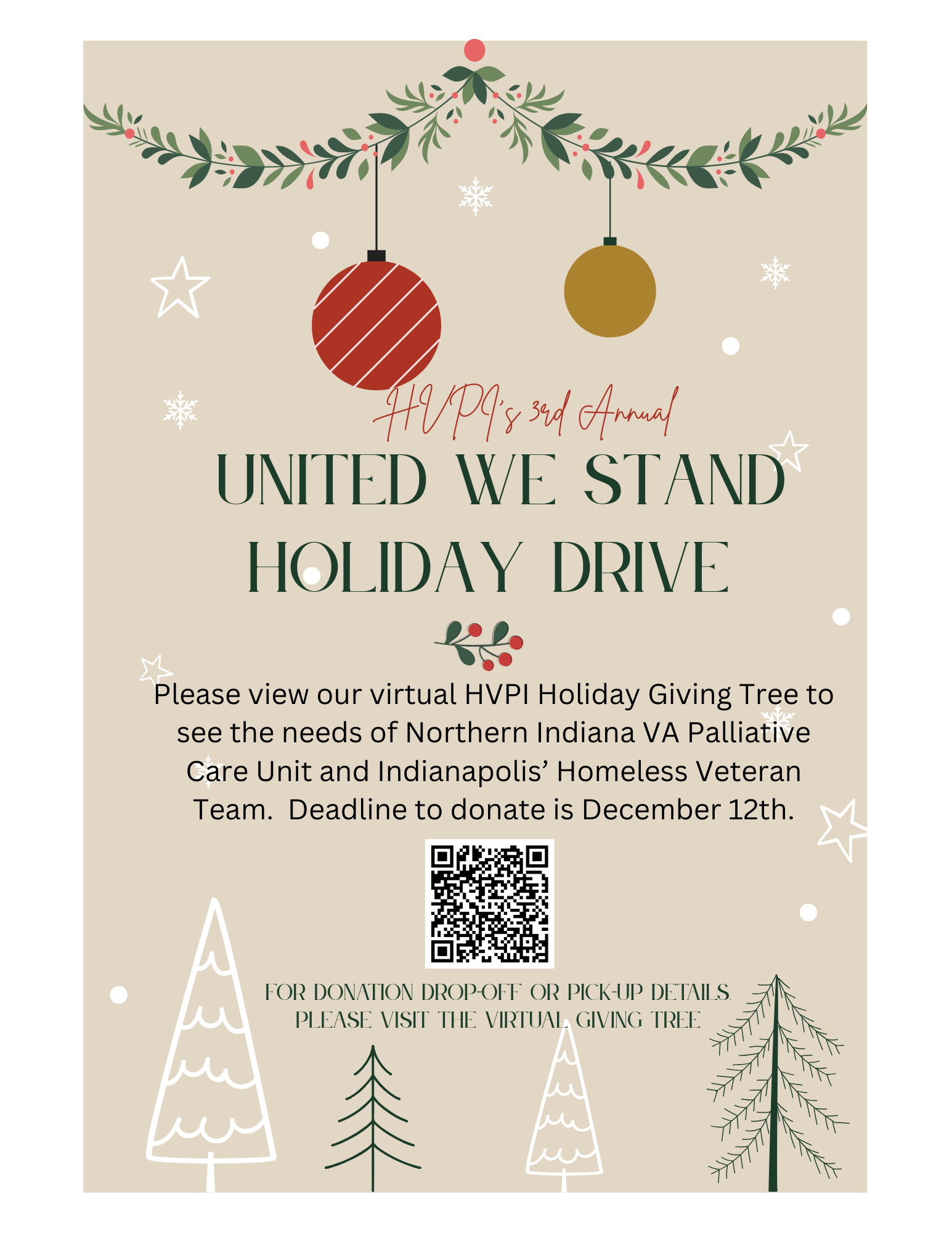 3rd Annual United We Stand Holiday Drive. This year we'll be supporting Homeless and newly housed Veterans as well as Marion's Palliative Care Unit. We're excited to see how much our Partners can gather this year! Please see our